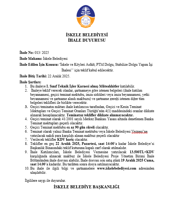 İskele Belediyesi, İskele ve Köylerinde yapılacak Asfalt, PTM Dolgu, Stabilize Dolgu Yapım İşi için ihale sürecini başlattı.
